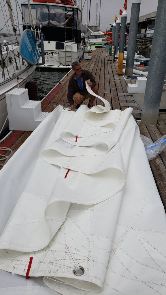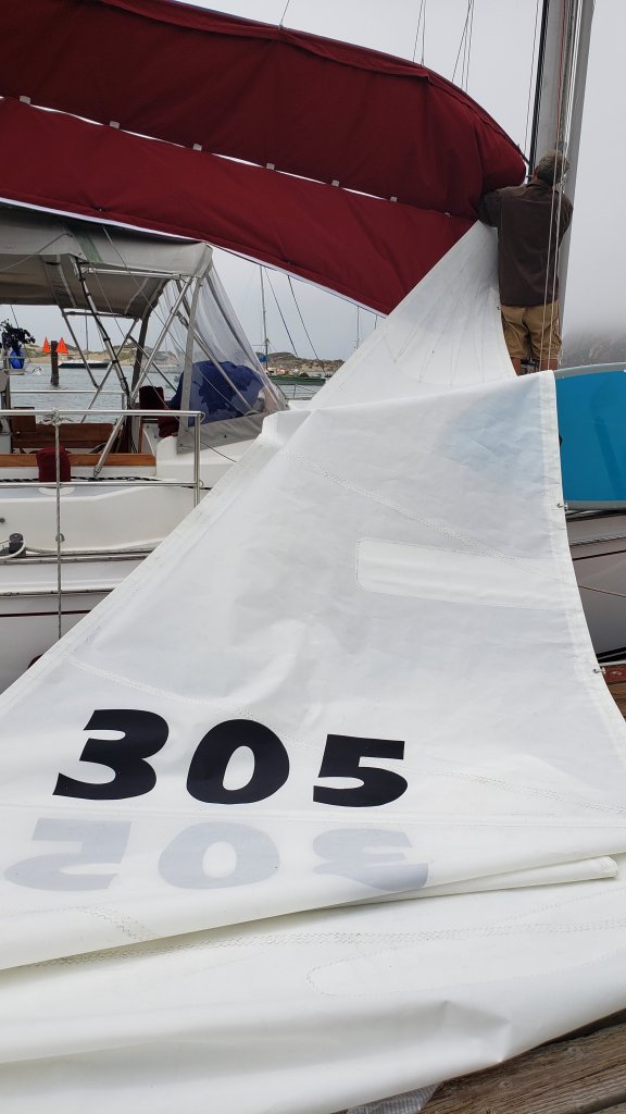 April 2020, yes, 5 months later. All Winter we tinkered on Sea Bella’s mast, which layed horizontally on sawhorses in our backyard. Scott installed stainless steel strengtheners inside the masts’ furling track every 10 inches. He also installed all new halyards, sheaves, wiring, LED lights, weather station, vhf antennae, radar mount, and rigging.