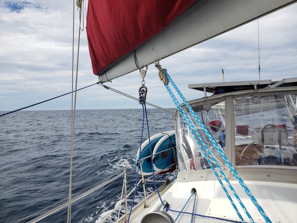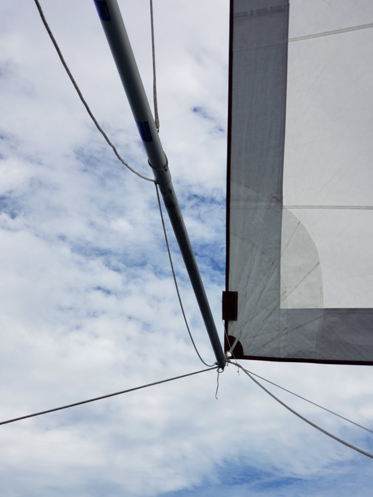 You can see below that our 24 foot whisker pole holds our Genoa out, since light wind and rolley swell will cause a sail to flog or flap in the wind, which can slow a boat down and be uncomfortable. The large white line is the jib sheet. The line on the right is the ‘guy’, discussed above. The topping lift is a line which holds the pole up horizontally. Lastly, the line under the pole is to extend it or shorten, if needed.