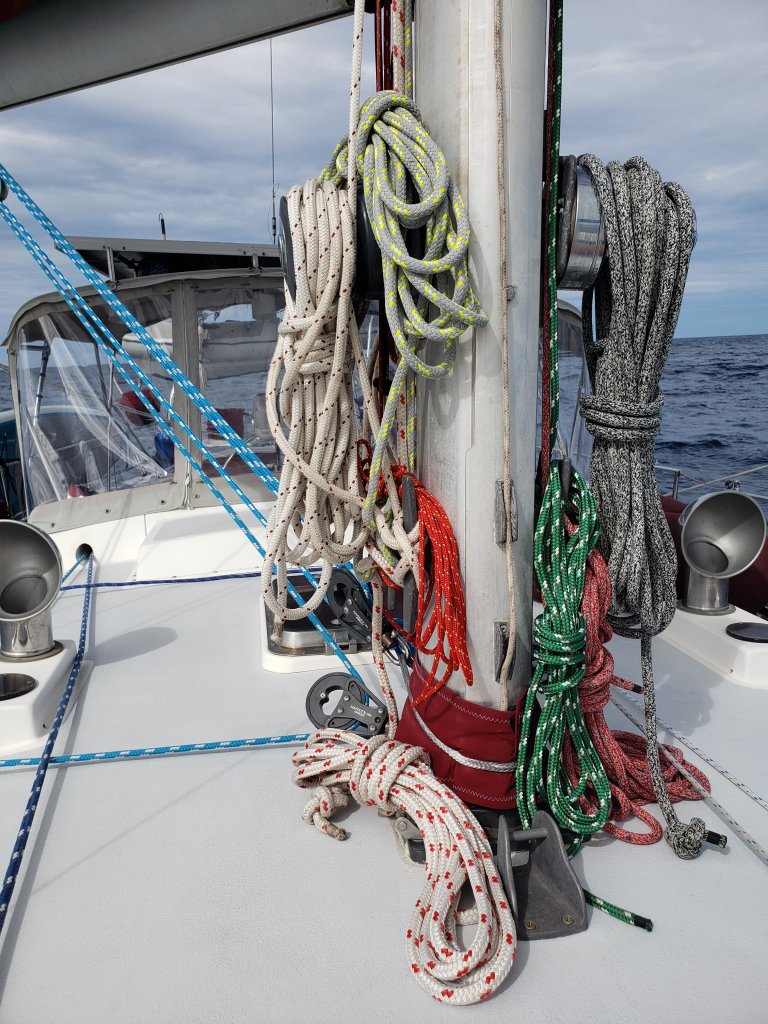 Many of our sailor friends and family know that ropes on a boat are referred to as lines or sheets. But it can get complicated and every boat has different types, colors, and sizes of lines. Since we now often sail down wind and in light breeze, we have the need for additional lines. After leaving the rugged and windy California coast in August 2021, and since we have been offshore and night sailing, we added a few important lines. I will attempt to identify them here by color and location (see picture above). Beginning on the port (left side of a boat) our yellow strap is referred to as a ‘jack line’. It is the line to clip your safety harness to, in dark or poor conditions. Next is our royal blue ‘Staysail sheet’ which pulls the sail out. Our newest line is our whisker pole ‘guy’, which is on the far left, on the outside of our boats’ lifeline wires. This ‘guy’ can be pulled in or let out which alters the poles’ location so slightly. Next, is the heavy white line, our ‘Genoa/jib sheet’ running nearly horizontally in the above photo (since our whisker pole is in use). On the port side, we run our 2 roller furling lines, one to the Genoa and one to our Staysail. One is blue dotted and the other is yellow dotted. Pulling these lines will furl or roll up the sails. To the Starboard, which is the right side of a boat, is our heavy blue preventer line. It clips on to the end of our boom (see below pic) to hold the mainsail as far out as possible, creating the fullest sail for downwind. As with most lines, they run back to the cockpit, for ease and safety. These pictures are taken while we are going ‘wing and wing’ which means one sail is to starboard and one sail is to port. Another line you see is the white line laying messily piled on the foredeck. We left at midnight, so I guess I was too sleepy to tidy it!This is a ‘snubber’ which is attached to the anchor chain when we are anchored. (It prevents tugging on the anchor chain all night). If you look close you will see the last line in the picture, it is dynema and it’s clipped to secure the anchor, as a safety back up. Below is a shot of the lines attached to the boom, in addition to the boom brake and the boom vang.