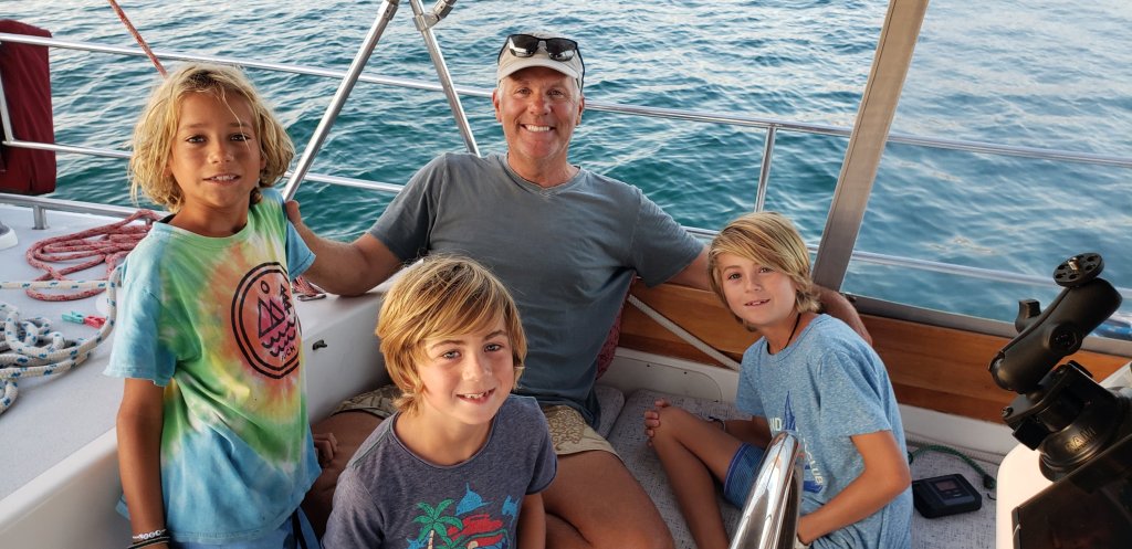 The Arkouda boys: Luca, Kai and Thad. When they sail into a bay their parents Mark and Carli report the boys always excitedly search for Sea Bella and just jump in and swim over to greet us for pretzels and lemonade. Awesome family.