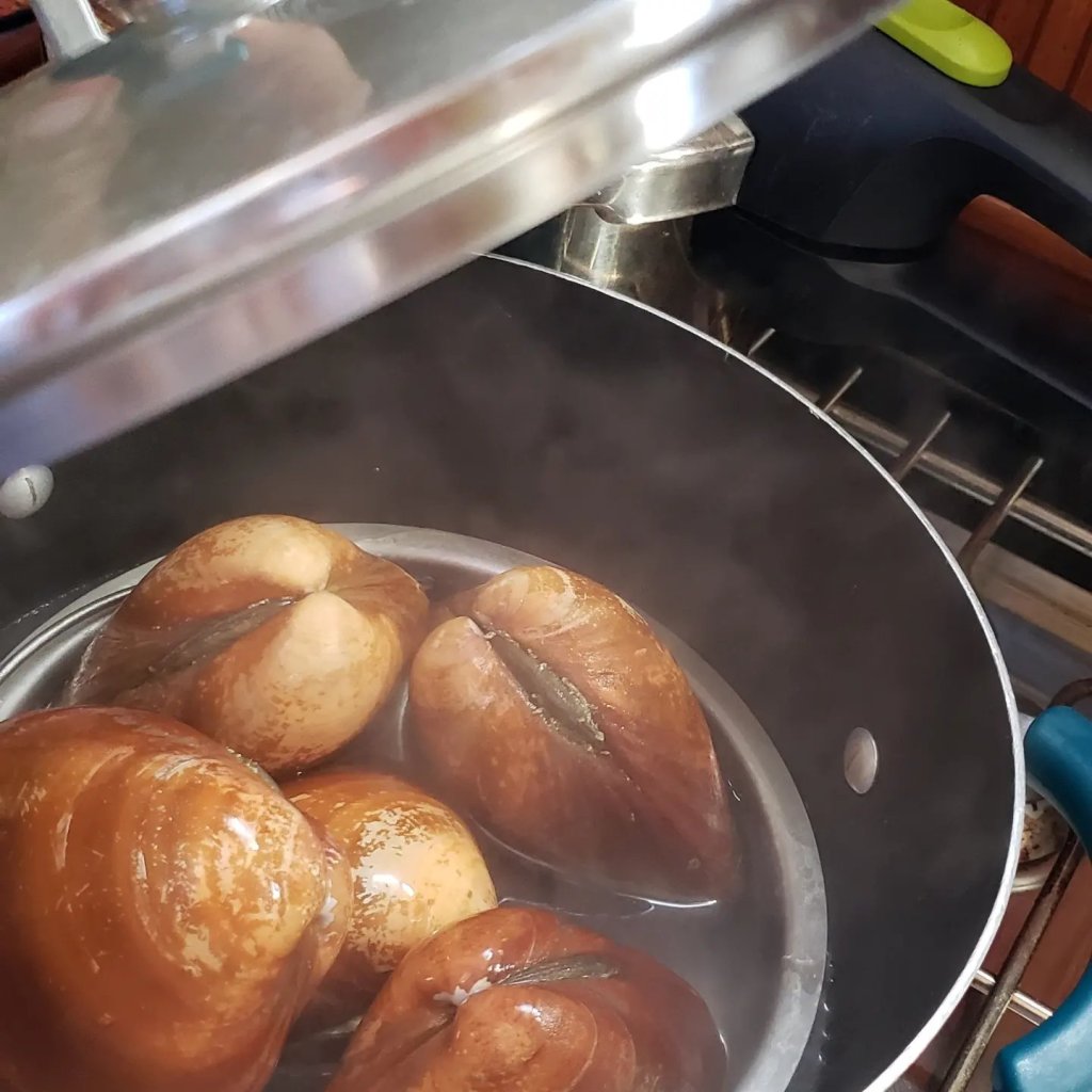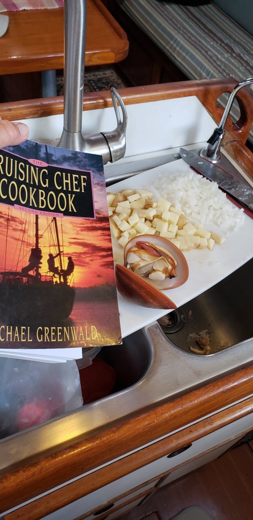 The other night, 3 local young fishermen in an old Panga boat came to our boat to sell huge clams, $1 each, $20 pesos. So, I made my first clam chowder, with stock from a snapper Scott caught spearfishing and homemade sourdough bread. This made us a few yummy dinners. Finding little markets are a few weeks apart, so good planning and provisioning is very important.