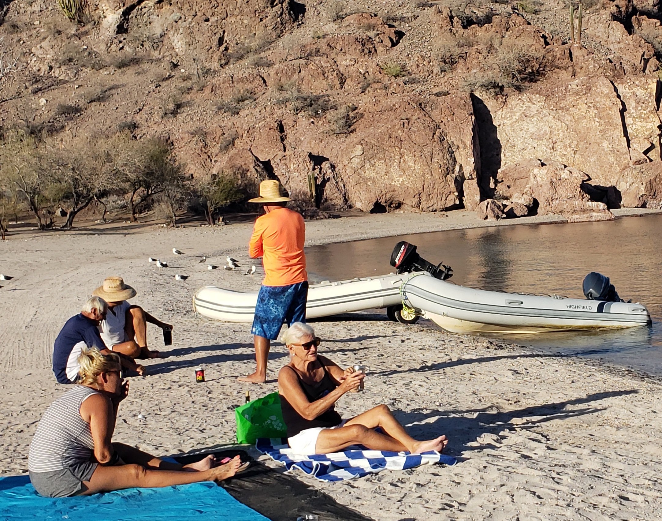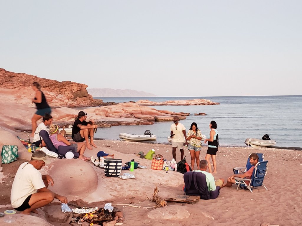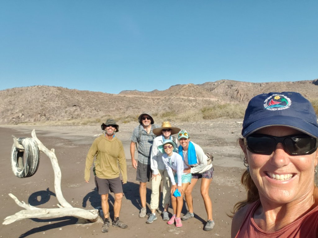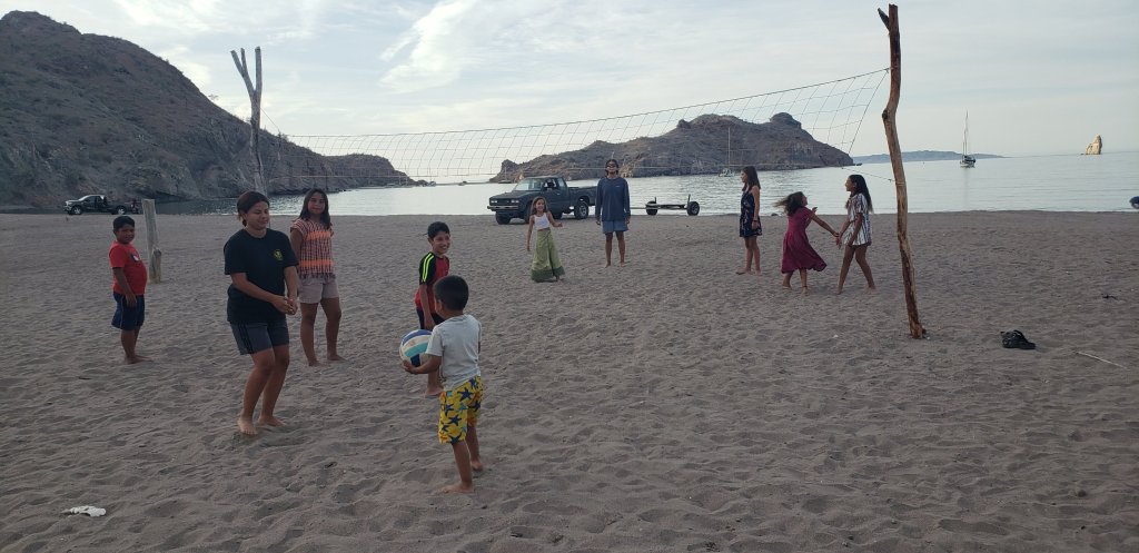 An awesome 4 mile hike with Simplicity and new friends on Flying Free; Kevin and Stacey. We actually met them back home buying a table for the garage at our Chico house. They have 7 adult children and have been enjoying this life for a few years, keeping their boat in Puerto Escondido. Stacey is such fun and still works, teaching English at Cuesta College remotely on Starlink. Kevin is a happily retired CHP officer from Morro Bay. Scott has been spearfishing with him, catching Cabrillo grouper.Playing sunset bocce ball is a hit, we invited a few locals to join us.New friends and neighbors for a week on little sailboat, Wings. Fred and Judy who have been around the world and liveaboards for 35 years. Off season they do the beer can races out of Puerto Vallarta. Mike and Leah learned a lot and shared some good stories. The boater kids meet up with the local kids and find a common interest of beach volleyball. Not much communication but a ton of fun!Potluck fish bbq is fun for all after a good day of spearfishing, hiking, snorkeling, paddleboarding and napping9. Red Rocks of Bahia Los Gatos reminded us all of Lake Powell and the mesa’s of Utah. New Kid boat friends on Foreigner, Captain Musick and Auryn. Regular beach parties in Agua Verde were a hit. A favorite spot for sure!Daily yoga lead by either Chrissy or Kathy. Agua Verde was the perfect setting for a gentle 1 hour wake up exercise. This was a break for all the boater moms too. From the left: Ingrid, Chrissy, Carli, Leah, Kathy, Dorothy, Stacey, and Beth.New kid friend Ella on the boat Nike. She is in heaven enjoying watermelon, a very uncommon fruit on the Baja. Happy Luca and Dannika.