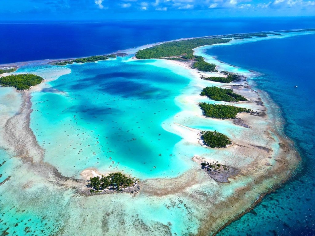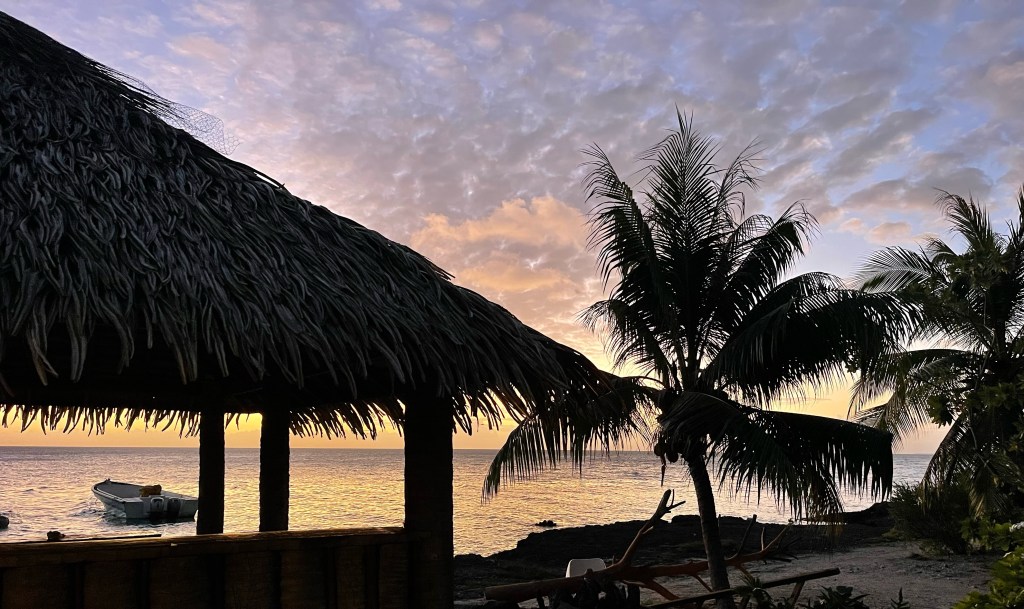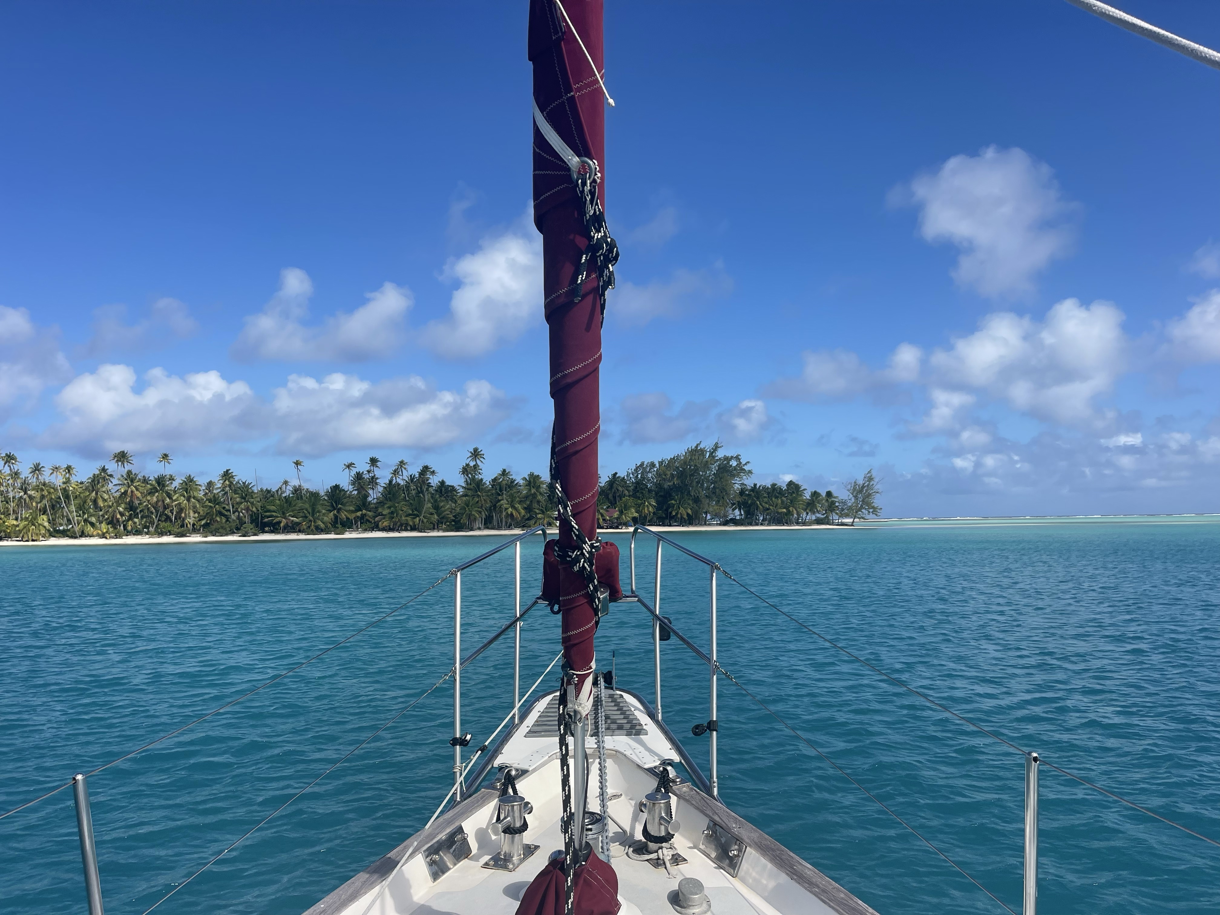 Since Scott and I chose to stay one year in French Polynesia, in early April ’23 we headed from the Marquesis directly to the Tuomotus. We sailed Sea Bella from Fatu Hiva, aiming as high on the wind as possible, sailed 3 days and landed in Atoll Amanu, a darling sleepy village which had the youngest Mayor in all of France. Two highlights; the children were so playful and engaging and the small reef in the middle known as Star Island was a colorful dream.