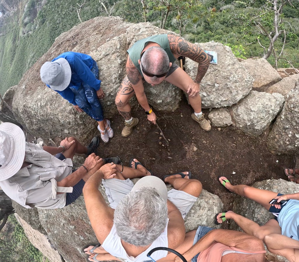 As we hiked up the Royal trail to the waterfall we came across dozens of Pae Pae’s or foundations of ancient buildings. We are amazed that they are basically in the process of returning to earth. Over grown jungle and trees growing through the middle of many of these ruins. Archaeology has shown that in some cases the heads of families members or warriors have been buried under rocks in the Pae Pae’s after the tribe or leaders ate the eyes and brain out of the skulls. (To take their visions and knowledge). We didn’t move any stones!