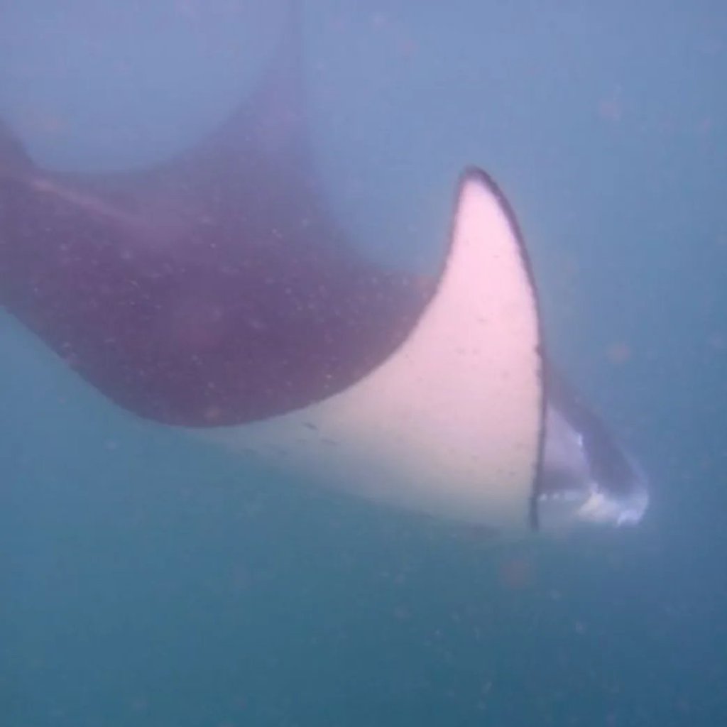 A few facts on Mantas: Kathy is intrigued by the Reef Manta Ray. Learning about these new friends; he can grow to a wingspan of 16 ft! But we have only seen these 3 of about 6-9 ft. You can see at the front of his face, he has a pair of cephalic fins which can be either rolled up in a spiral for quicker swimming or they can be flared out in front to channel the plankton filled water for feeding. I watched today that he has a small dorsal fin and a long black tail without a spine or barb like his cousins have.